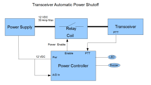 The Arduino will maintain a “watchdog timer” which will be started any time a transmission begins. The watchdog counts down until it either expires (at the three minute duration point), or it is reset because the transmission ends. If it expires, an automotive relay is deactivated, removing the 12 VDC power from the rig. After some timeout period, an attempt will be made to reset the power.