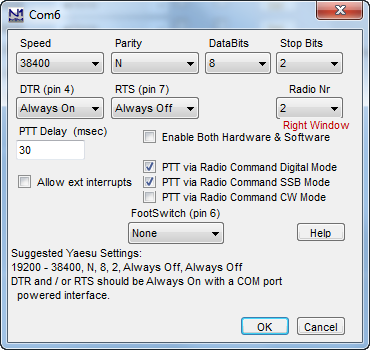 This shows the N1MM Port settings (the first 6 boxes). I am using a 2-radio setup, That is why you see “Right Window” and “Radio Nr2” here. The last thing to do is to get the PC Port settings correct for the COM Port you are using,