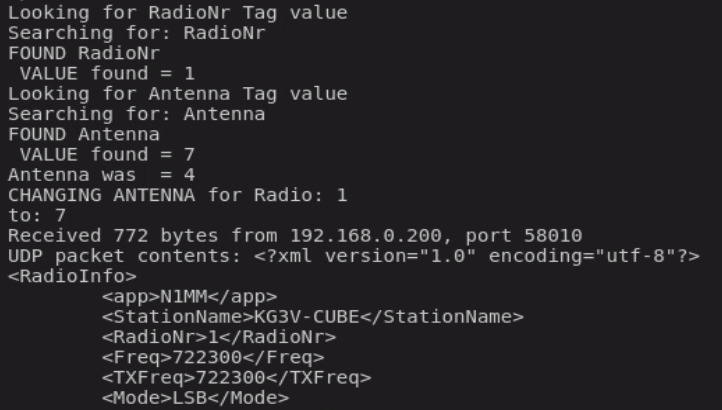 In N1MM, using the LOG window for either of the two radios, you just press ATL-F9 to cycle through available antennas. Only antennas that have been designated as usable on the current Radio Band are made available. If an antenna is already in use by the other radio, it is NOT available for selection for this radio. The text display below shows a debugging screen depicting the antenna selection process.