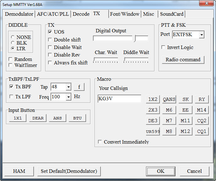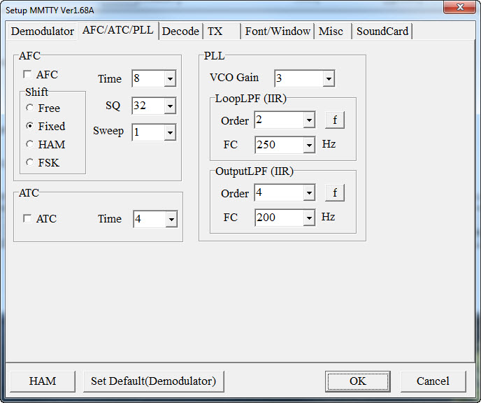 The next screen TAB shows Demodulator settings. I think I used all Default settings here, but these assume you will be using RTTY Mode on your Rig, with the ability to tune the RTTY signal at 2125 Hz with 170 Hz shift.
